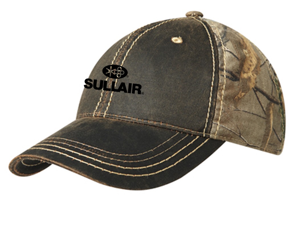 A pigment print on the front panels, visor and closure gives this cap an oiled leather look. A popular camo pattern completes the mid and back panels.
